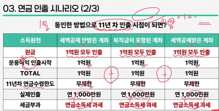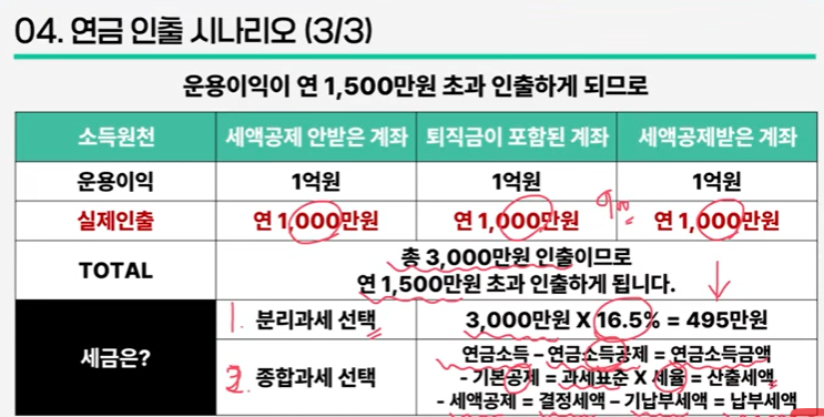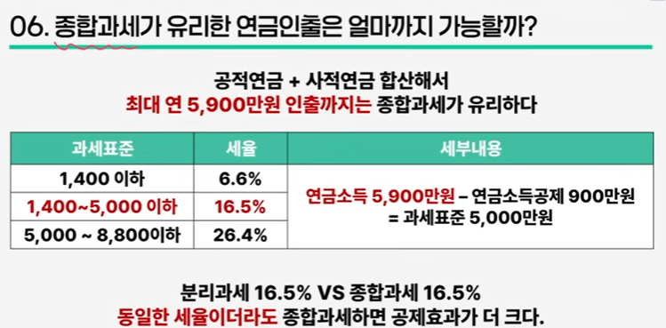 즉 연 5900만원 인출(공적연금 + 사적연금)까지는 종합과세가 유리함. 월 491만원 수령