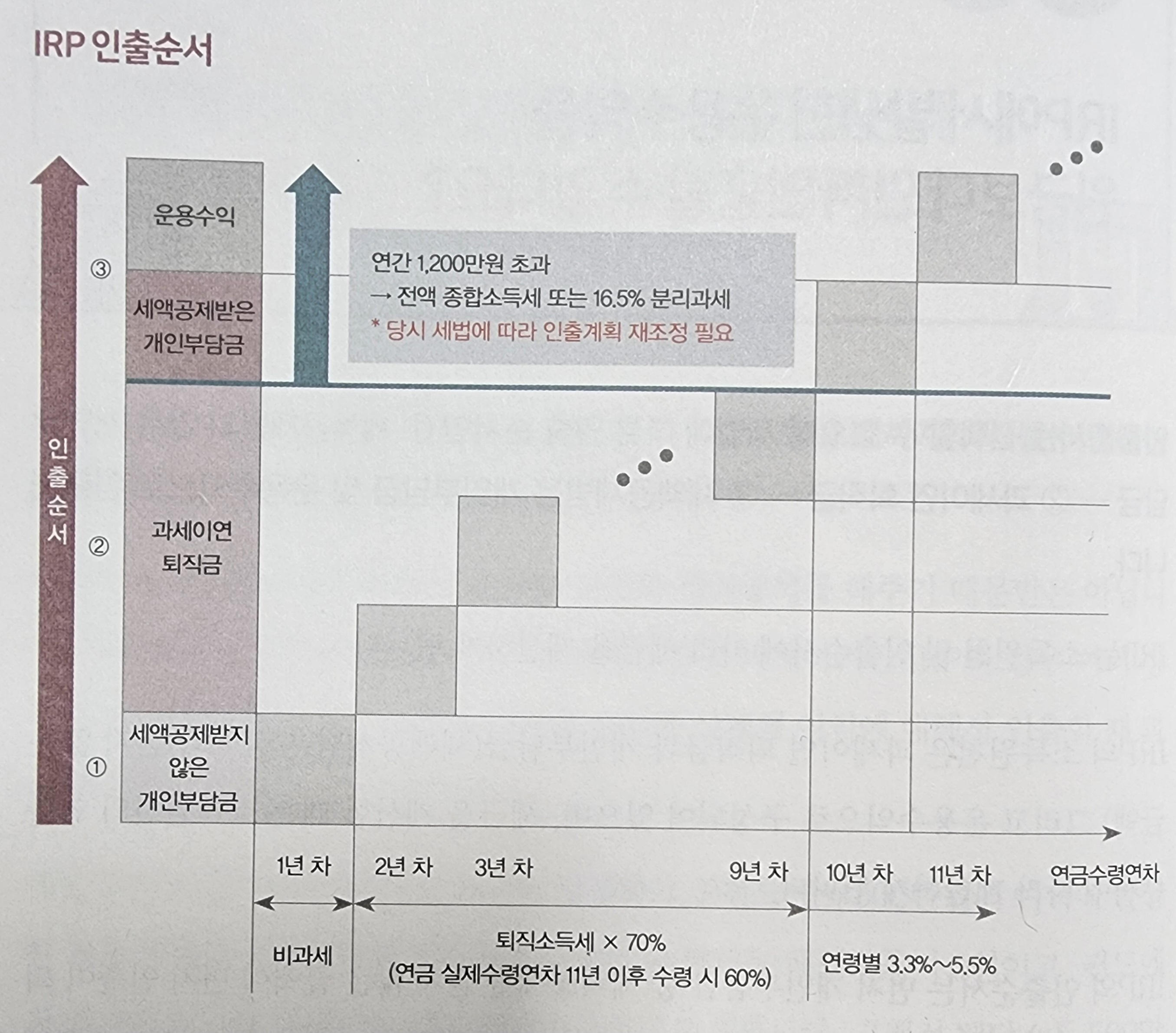 인출순서는 세액공제받지 않은 개인부담금, 과세이연 퇴직금, 세액공제받은 개인부담금 및 운용수익 순으로 정해져서 과세된다.