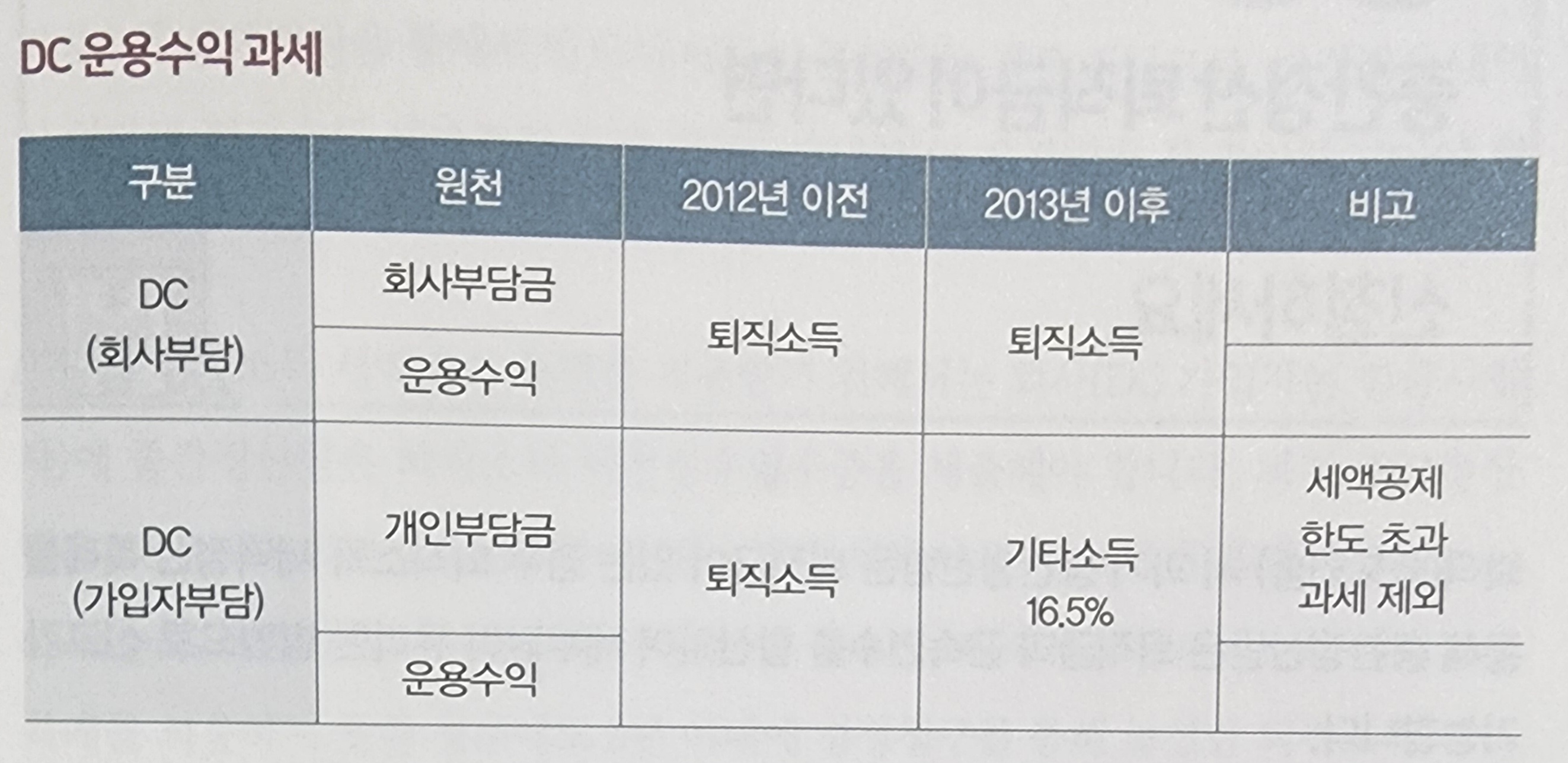 (DC, IRP 운용수익 과세) 운용수익은 소득원천에 따라 달라지는데, 일시금으로 수령 시 사용자부담금에서 발생한 운용수익은 퇴직소득으로 과세하고, 개인부담금에서 발생한 운용수익은 연금수령하지 않고 일시금 수령할 때 기타소득 16.5%으로 과세한다.