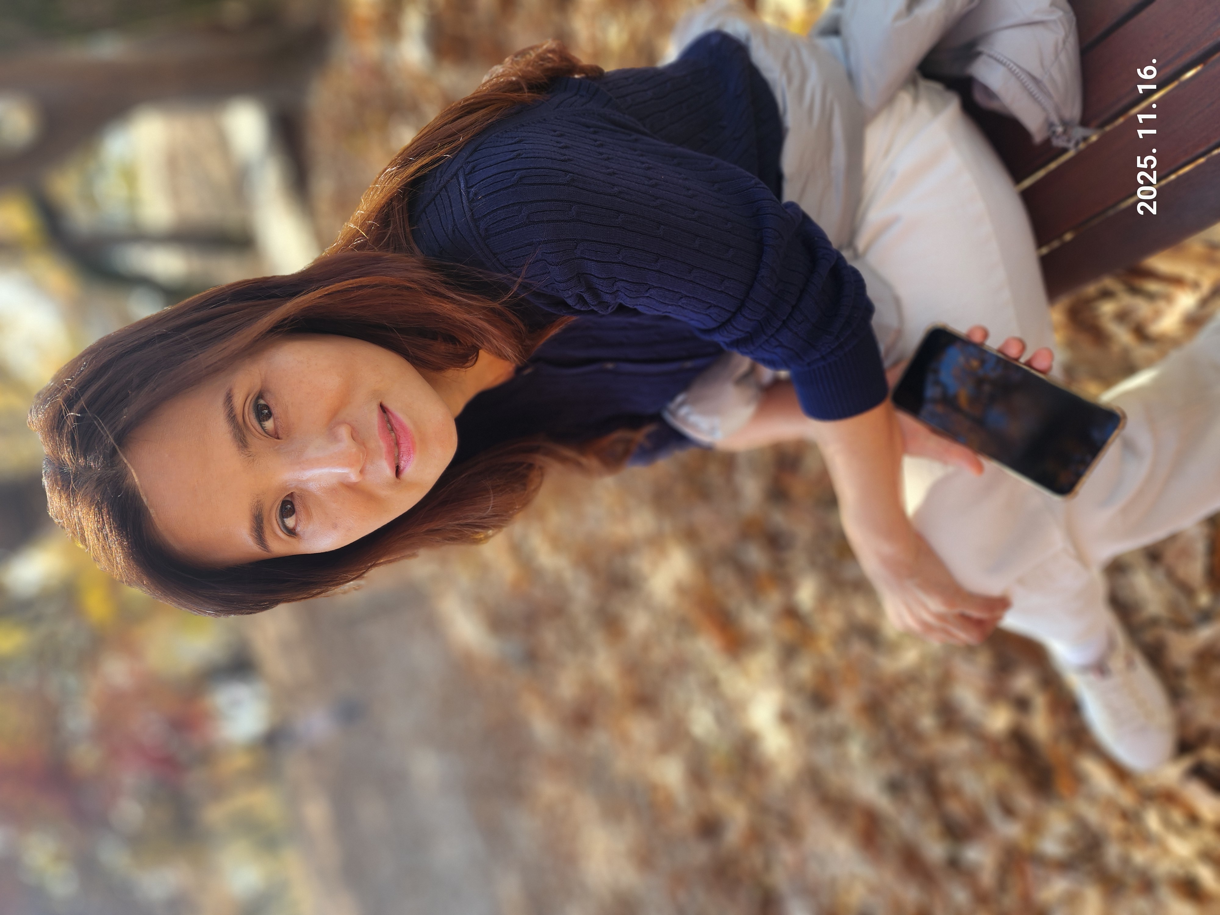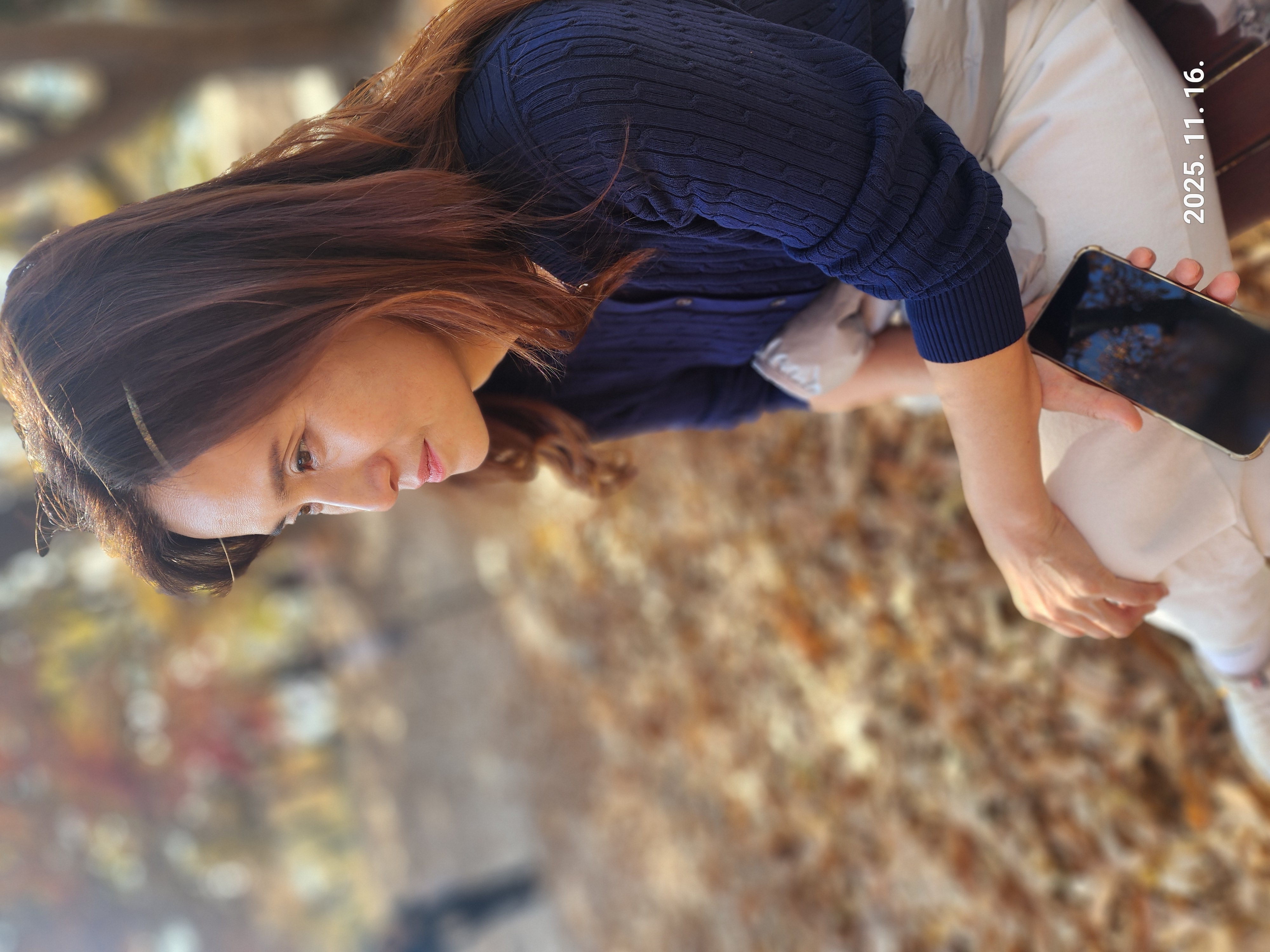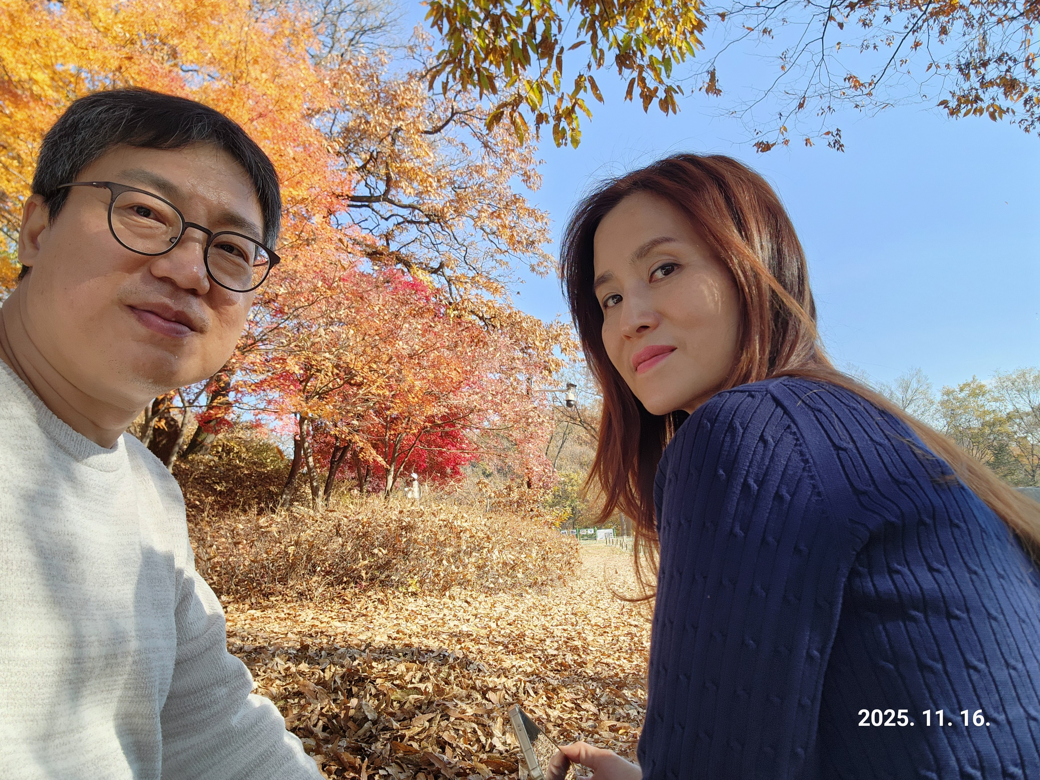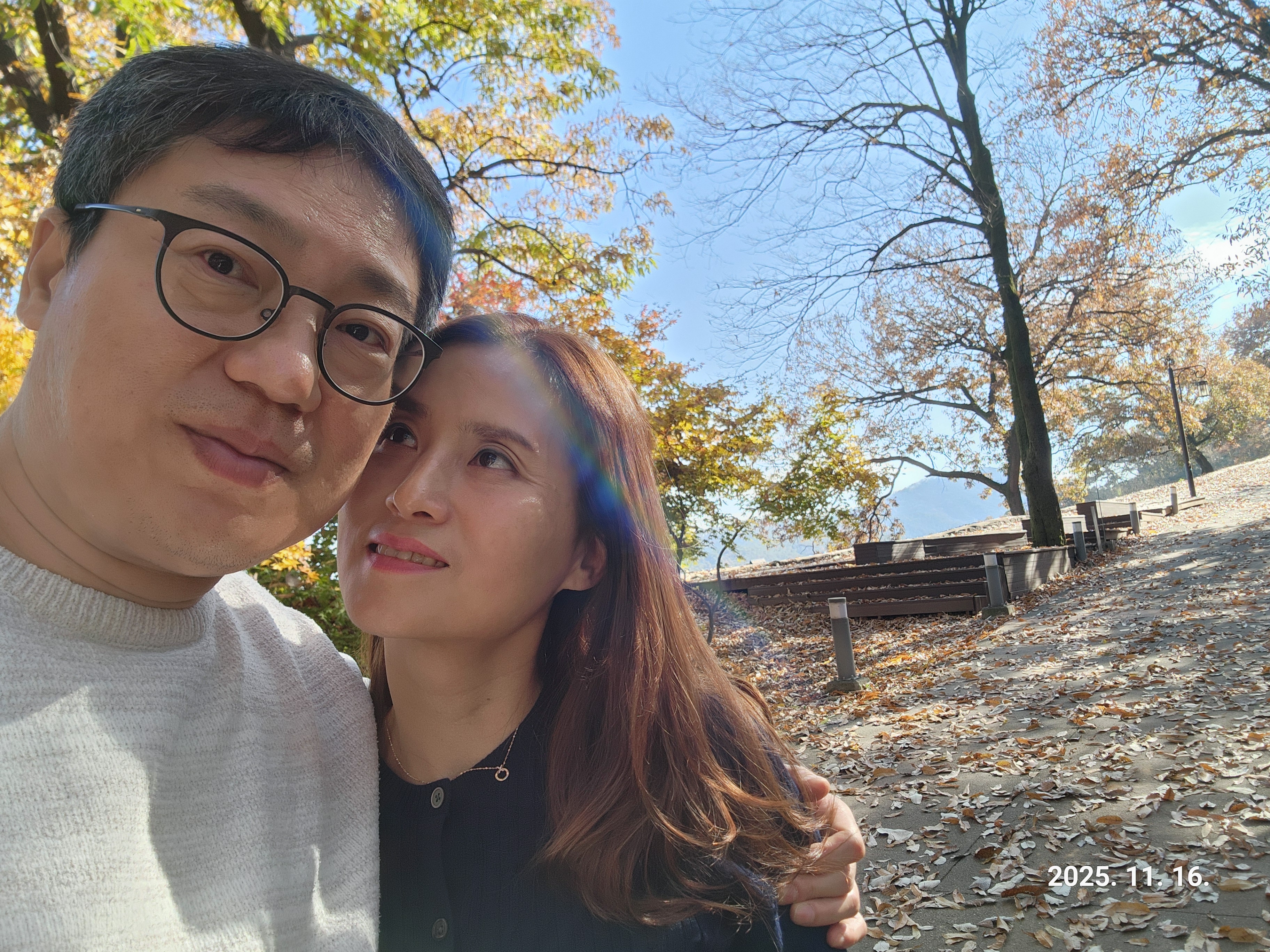 가운데 낙엽 진 길을 걸으며 대화를 나눈다.