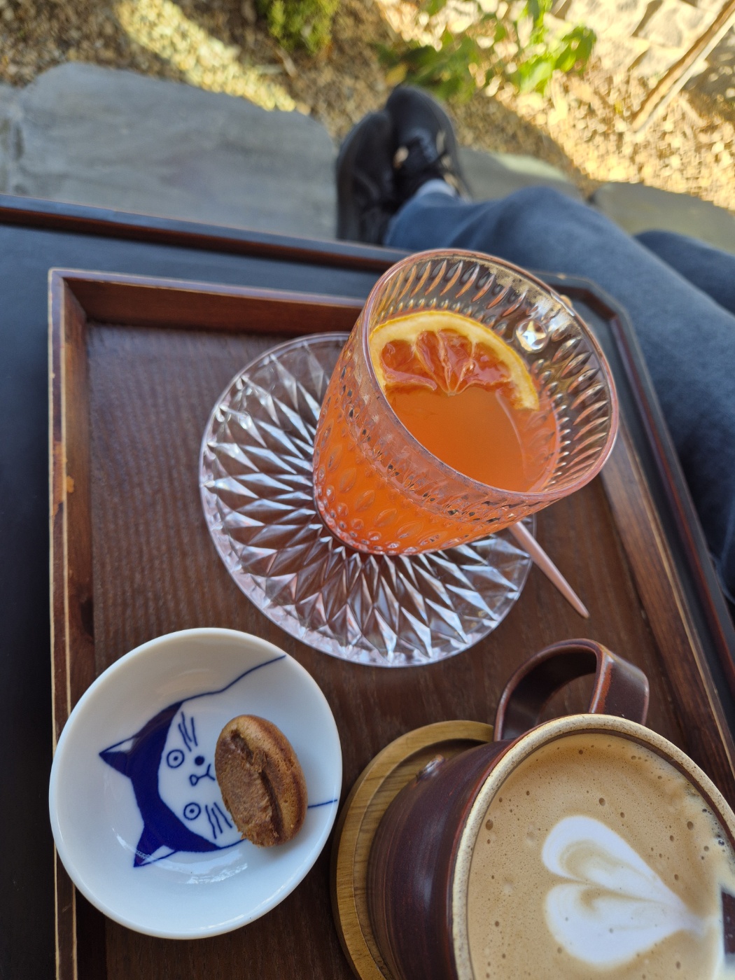 찾아나선 공산성 거리. 동물원을 연상시킨 공다방, 북적거린 밤빵카페, 소소한 전통찻집 미담, 그리고 빨간색 문의 메리봉봉을 지나 아까 식당 대기하며 봤던 길건너 정자방길 카페.