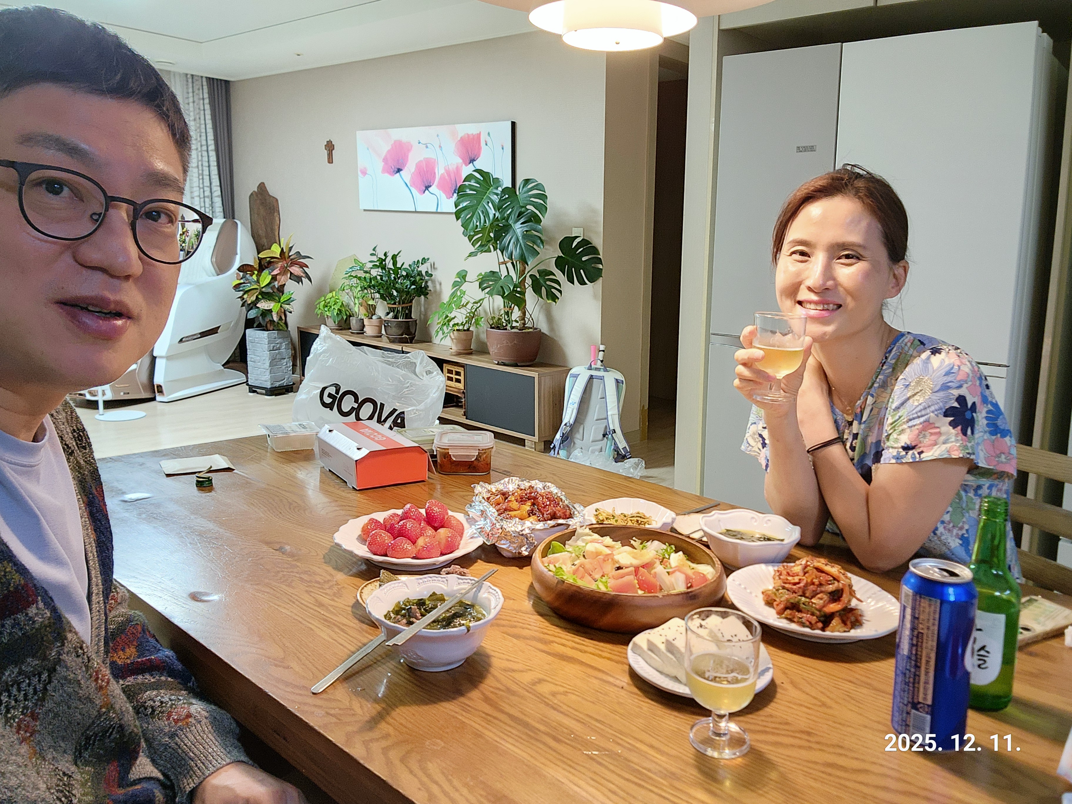 지코바치킨과 샐러드, 거기에 김장 김치와 딸기, 그리고 사 온 두부까지! 푸짐한 상을 차려놓고 소주와 맥주를 섞어 마시며 하루를 마무리했습니다.