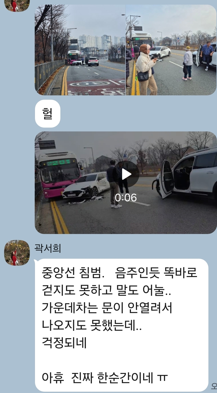 아내가 탄 버스도 사고를 피하기 위해 "어, 어, 어! 하다가 쿵!" 하고 급정거를 했다는 겁니다. 마주 오던 승용차가 중앙선을 침범해 1차선 승용차를 들이받는 사고를 목격했던 거죠. 사고가 난 현장 뿐만 아니라, 아내가 타고 있던 버스까지 큰 충격을 받았다는 이야기에 가슴을 쓸어내렸습니다.