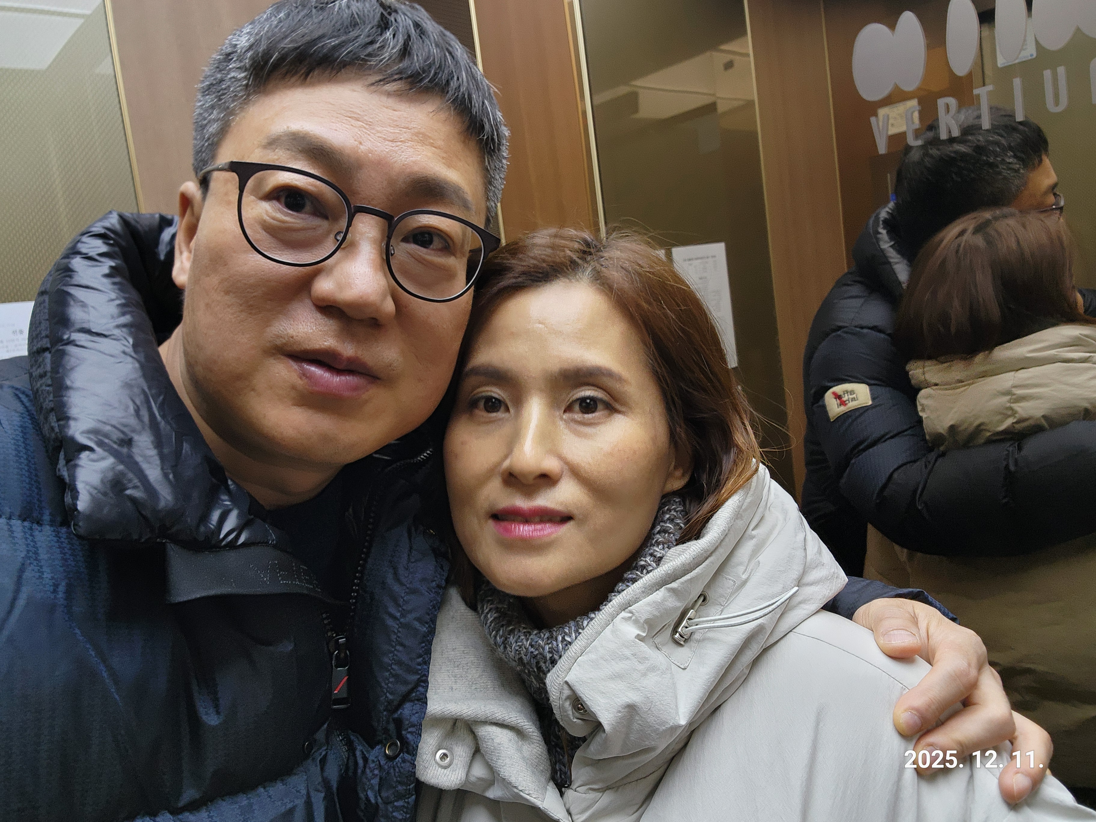 엘리베이터를 탔을 때, 우리는 다정한 포즈로 사진을 찍었습니다. 😊