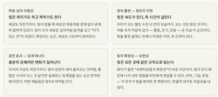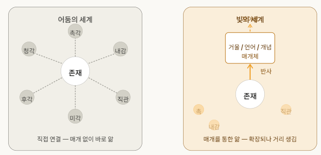 빛은 여기서 단순한 물리적 빛이 아니라 언어, 개념, 의식, 문명, 외부 세계를 모두 포괄하는 은유입니다. 그리고 어둠은 단순한 부재가 아니라 내부, 직관, 몸, 비언어적 감각의 은유입니다.
