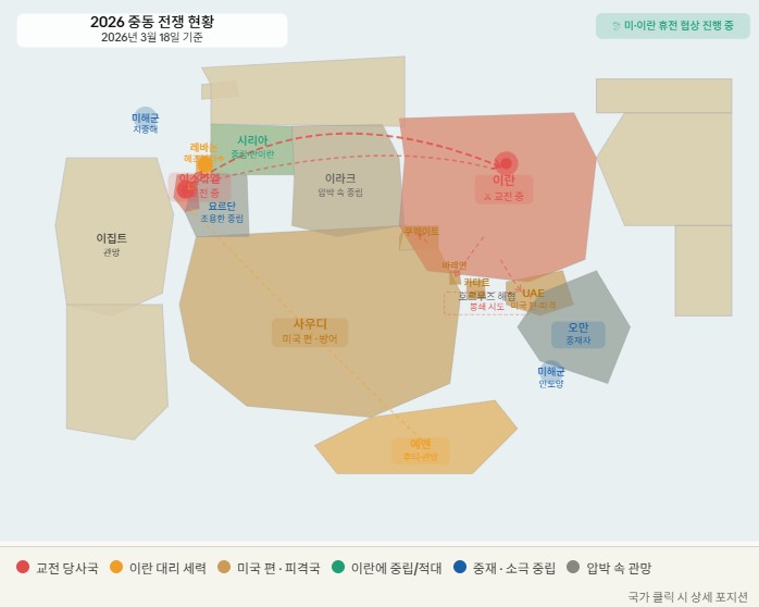 ② 호르무즈 해협 — 이란의 기뢰 설치와 봉쇄 시도로 선박 운항이 사실상 중단되었고 국제 유가가 급등했습니다. Cliktoday 트럼프는 3월 16일 이란이 합의를 원한다고 밝히며 휴전 협상 개시를 공식 확인했습니다. G-News