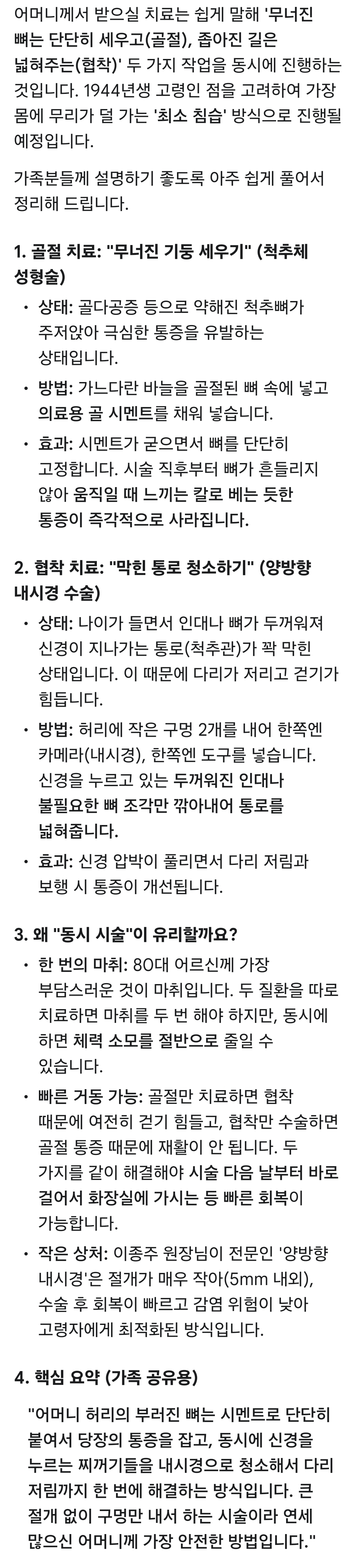 수술 예정시간을 한 참 넘겨 시작되었다. 나중에 듣기론 수면 마취를 하지 않았다고 하신다. 톱질하고 잘라내고 하는 소리를 다 들었다고. 강한 어머니다. 수면에서 깨지 못할 두려움 때문이라는 며느리 말이 맞을지, 맞닿드리는 성향, 참을 만 하다면 참고 보는 충청도 어머니의 기질 때문인지 모르겠지만, 그로인한 효과는 수면 마취를 훨씬 능가한다. 수술방에서 바로 나올 수 있었으니. 그리고 예후 또한 좋을 수 밖에 없으니.
