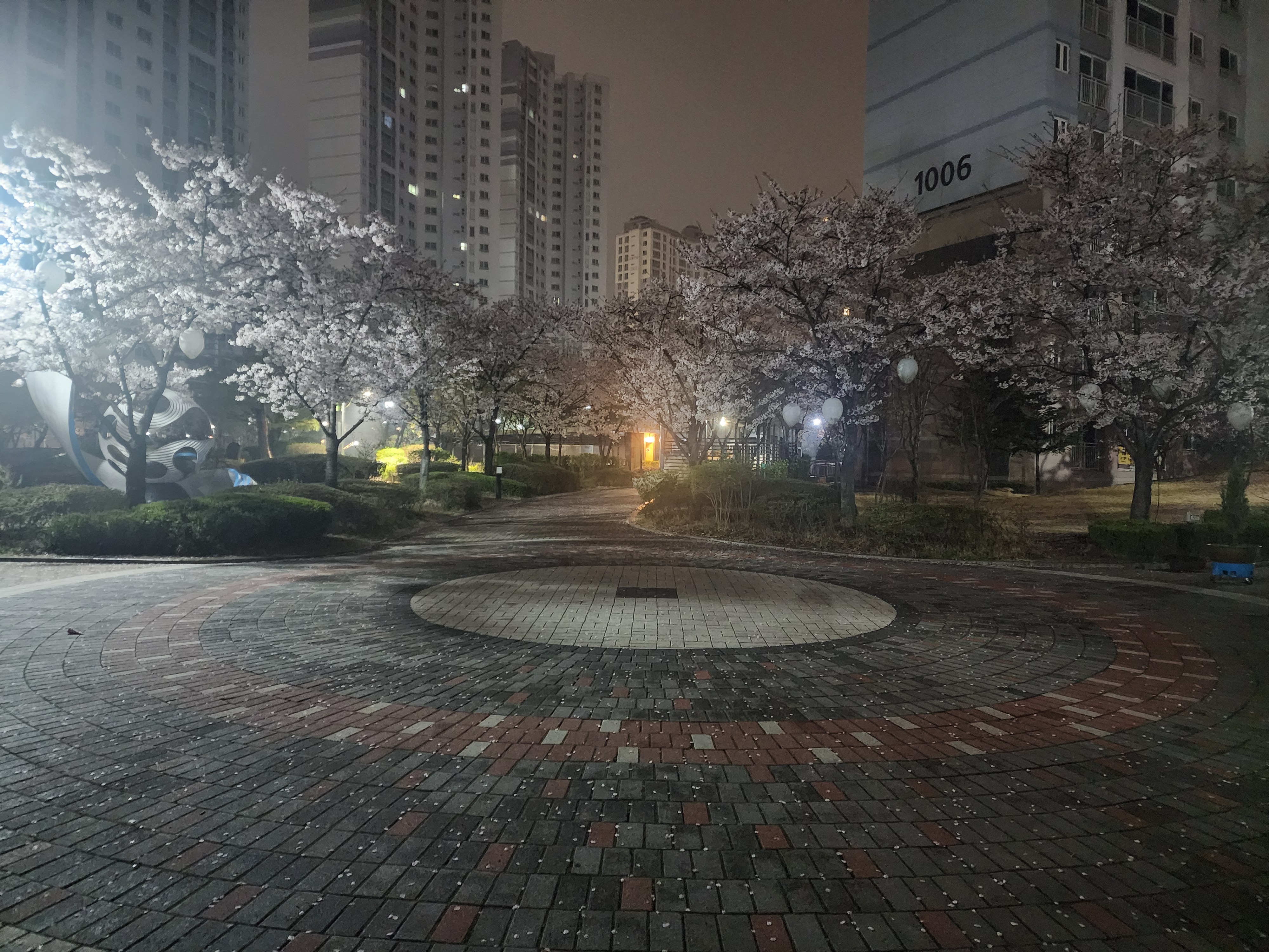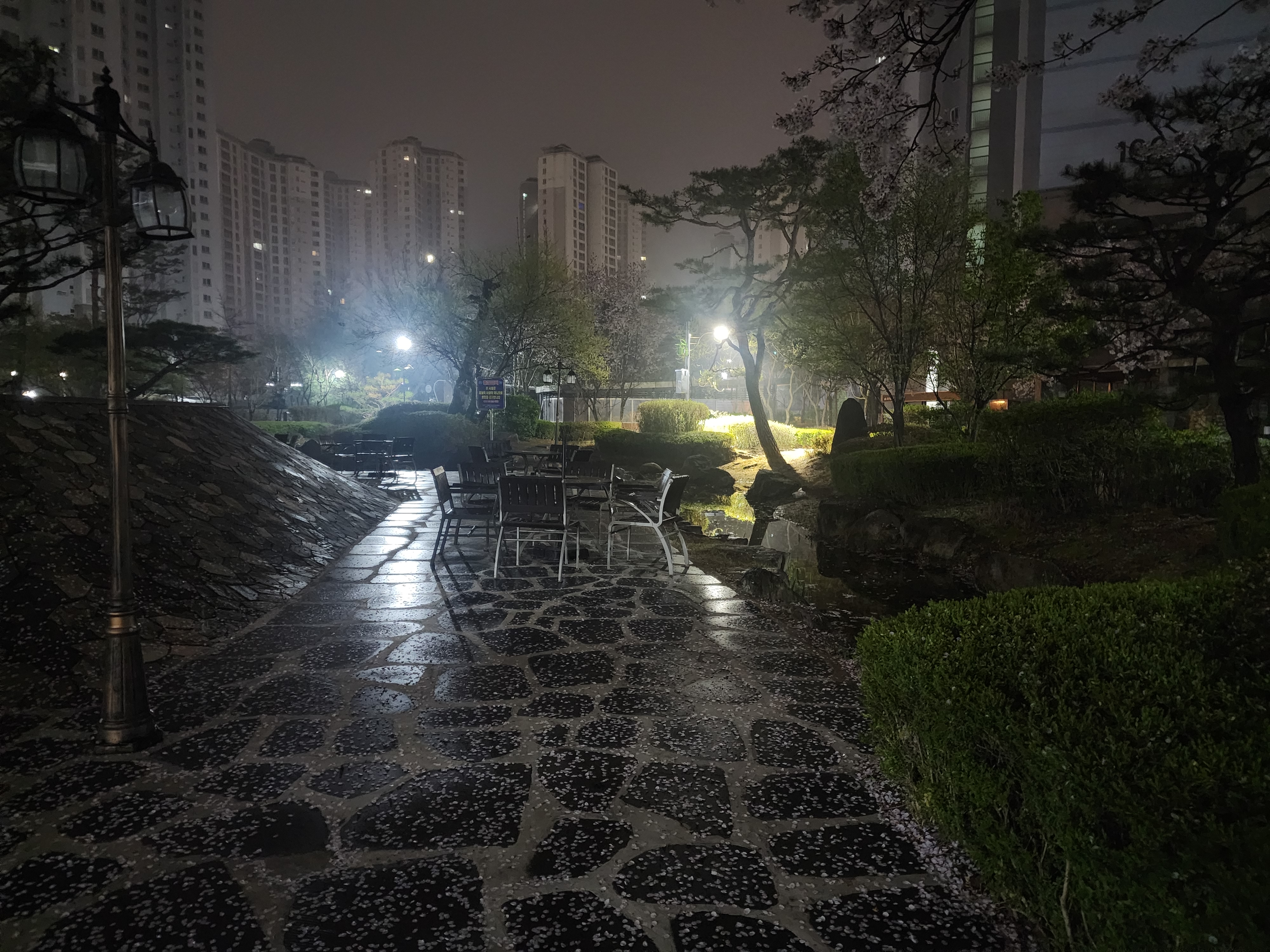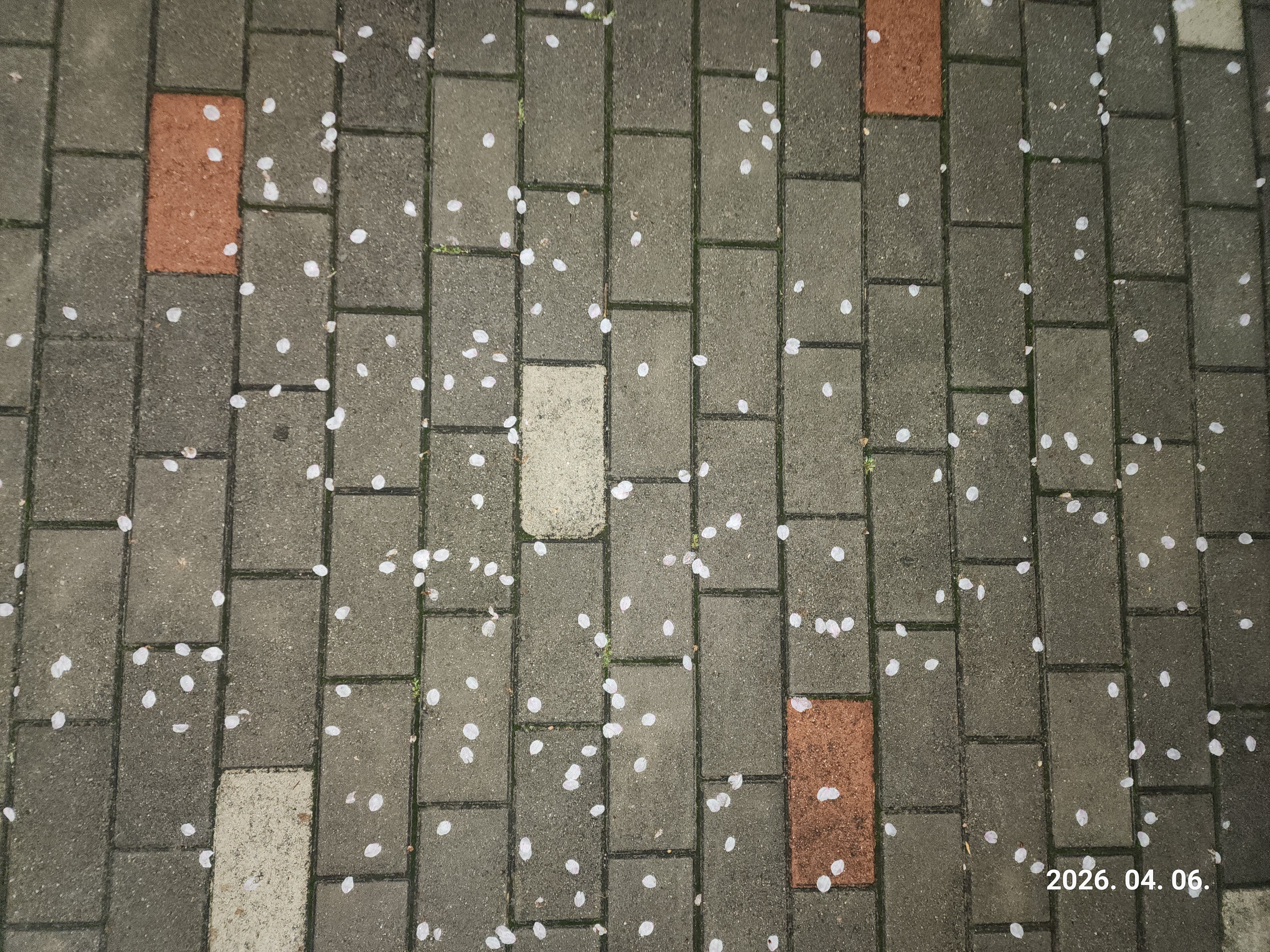벚꽃이 만개했다가 비를 맞아 잎사귀가 바닥을 수놓았다.